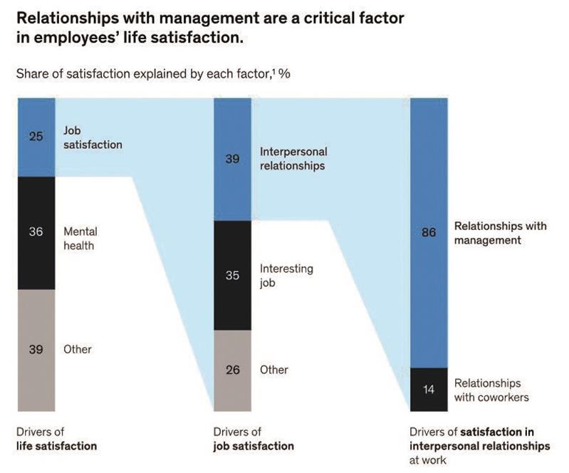 مدیران و سرپرستان در ایجاد خوشحالی و رضایت شغلی کارکنان نقش بسیار مهمی دارند. ارتباط مثبت با مدیریت بهعنوان یکی از عوامل کلیدی در رضایت شغلی کارکنان شناخته میشود و این رضایت شغلی نیز دومین عامل مهم در تعیین سلامت روانی و جسمی کارکنان است. طبق تحلیلها، تنها سلامت روان از اهمیت بیشتری برای رضایت کلی زندگی برخوردار است. تحقیقات همچنین نشان میدهد که بیشتر افراد مدیران خود را از ایدئالها دور میبینند؛ بهطور مثال، در یک نظرسنجی منتشرشده توسط مکنزی (Mckinsey)، 75 درصد از شرکتکنندگان اذعان داشتند که استرسزاترین بخش شغلشان، رئیس مستقیم آنهاست. شکل شماره ۱ نتایج این نظرسنجی را به تصویر کشیده است.