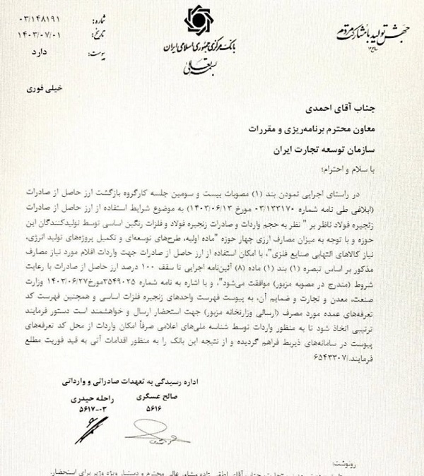 نامه بانک مرکزی مبنی بر موافقت تخصیص ۱۰۰ درصد ارز حاصل از صادرات واحدهای زنجیره فلزات به واردات خود (مواد اولیه، ماشین آلات طرحهای توسعهای، طرحهای انرژی و کالاهای التهابی) ابلاغ شد