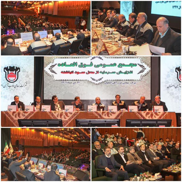 مجمع عمومی فوق العاده ذوب آهن اصفهان ۳۰ دی ماه به ریاست مهدی کوهی رئیس هیات مدیره ذوب آهن اصفهان، ایرج رخصتی مدیرعامل و دبیر مجمع، درخشنده نماینده سازمان تامین اجتماعی و شرکت صدرتامین به عنوان ناظر مجمع، حسین سعیدی نماینده شرکت های صبا تامین و فرآورده های نسوز ایران به عنوان ناظر دوم مجمع، احمد سلیمی معاون مالی و اقتصادی ذوب آهن، نماینده سازمان بورس و اوراق بهادار، نماینده سازمان بازرسی، بازرس قانونی و سهامداران حقیقی و حقوقی در تالار آهن روابط عمومی این شرکت برگزار شد.
