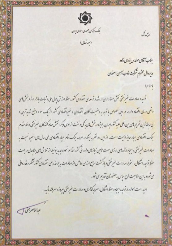 عبدالناصر همتی رئیس کل بانک مرکزی جهموری اسلامی ایران با اهداء لوح سپاس به مهندس منصور یزدی زاده مدیرعامل ذوب آهن اصفهان، از نقش این شرکت در صادرات غیر نفتی، ایجاد درآمدهای ارزی جهت تامین نیازهای وارداتی، حفظ تولید، اشتغال، استمرار صادرات غیر نفتی و بازگشت منابع ارزی حاصل از صادرات به چرخه رسمی اقتصادی کشور تشکر و قدردانی نمود. متن این لوح سپاس بدین شرح است: