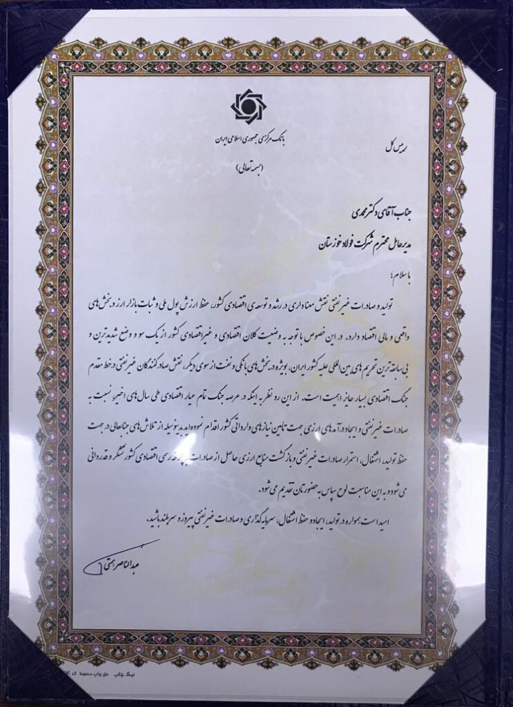 تقدیر بانک مرکزی ایران از نقش شرکت فولاد خوزستان در استمرار صادرات غیر نفتی و بازگشت منابع ارزی به کشور