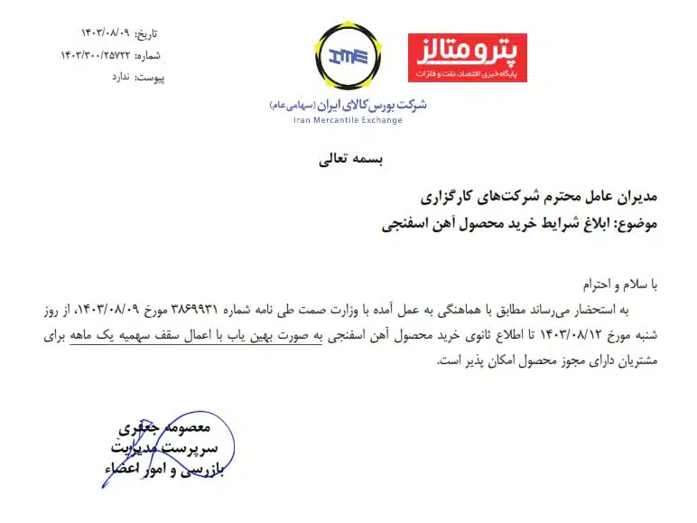 بورس کالای ایران امروز طی ابلاغیهای اعلام کرد که از روز شنبه ۱۲ آبان ۱۴۰۳ تا اطلاع ثانوی، خرید محصول آهن اسفنجی به صورت بهینیاب با اعمال سقف سهمیه یک ماه برای مشتریان دارای مجوز محصول امکانپذیر خواهد بود
