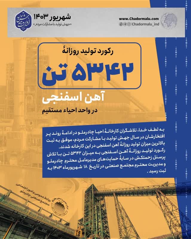 شرکت معدنی و صنعتی چادرملو موفق به ثبت رکورد تولید روزانه ۵ هزار و ۳۴۲ تن آهن اسفنجی در واحد احیا مستقیم شد