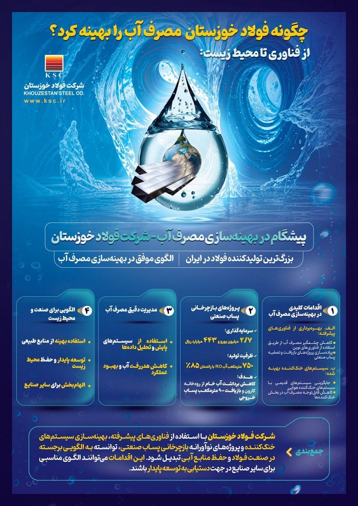 شرکت فولاد خوزستان بهعنوان یکی از بزرگترین تولیدکنندگان فولاد در کشور، با اقدامات استراتژیک و نوآورانه خود در زمینه بهینهسازی مصرف آب، الگوی موفقی در صنعت ایران به شمار میآید