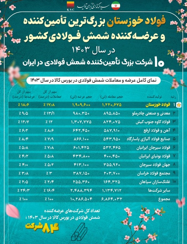 حجم عرضههای شمش فولادی این شرکت در بورس کالا البته بیش از این میزان بود و فولاد خوزستان با عرضه ۱,۹۰۹,۶۰۰ تن شمش فولادی ۱۸.۶ درصد از کل عرضههای شمش فولادی در بورس کالا در سال ۱۴۰۳ را به خود اختصاص داد.