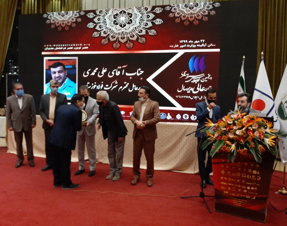 در این مراسم نشان عالی مدیر سال به دلیل عملکرد مثبت در حوزه پایداری کسب و کار، خلاقیت، نوآوری و اشتغال زایی به ویژه در شرایط تحریم ها به علی محمدی مدیرعامل شرکت فولاد خوزستان اعطا شد.