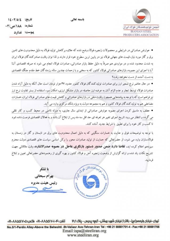 در این نامه ضمن اشاره به عدم مشورت با تشکل ها در فرآیند تصویب عوارض صادراتی مذکور، عنوان شده است: « مطابق هیچ یک از تعاریف بین المللی، محصولات فولادی همچون بیلت و بلوم و تختال، مواد خام یا نیمه خام محسوب نمی شود چرا که پس از اکتشاف و استخراج سنگ آهن از معادن، بیش از ۵ مرحله فرآوری (خردایش، تغلیظ، کنسانتره سازی، گندله سازی و احیاء مستقیم آهن) را طی می کند و نهایتاً در کارخانجات فولادسازی، ذوب و در واحد ریخته گری به شمش یا تختال تبدیل می گردد! »