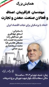 همایش بزرگ مهندسان و کارآفرینان اصناف و فعالان صنعت، معدن و تجارت با مسعود پزشکیان کاندیدای چهاردهمین دوره انتخابات ریاست جمهوری دوم تیر ساعت 18 در محلدر ستاد انتخاباتاتی این کاندیدا برگزار می شود