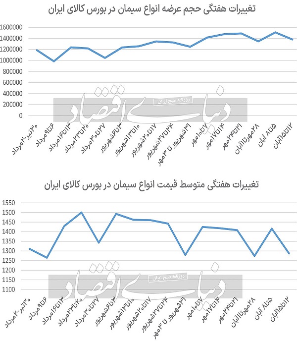 رشد عرضه انواع سیمان به بازار، در نیمه اول پاییز، بهای هر کیلوگرم از این ماده اولیه ساختمانی را نزولی کرد. با شکستهشدن رکورد هفتگی عرضه سیمان در هفته معاملاتی قبل (عرضه بیش از یکمیلیون و ۵۰۰ هزار تنی در معاملات ۵ تا ۸ آبان) و همچنین عرضه بیش از یکمیلیون و ۳۸۰ هزار تنی انواع سیمان در معاملات هفته جاری بازار سیمان (بازه ۱۲ تا ۱۵ آبان)، قیمت پایه و قیمت نهایی معاملات این محصول صنعتی کاهشی شد.
