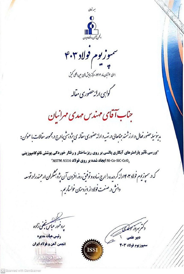 گفتنی است، کارشناس برنامه ریزی تولید فولاد خوزستان، همزمان یک مقاله دیگر با عنوان بررسی تاثیر ذرات کاربید سیلیسیوم-اکسیدسریم بر روی ریزساختار، رفتار خوردگی و سختی پوشش نانوکامپوزیتی نیکل-کبالت-کاربیدسیلیسیوم-اکسیدسریم ایجادشده روی فولاد را پس از پذیرش در انجمن آهن و فولاد ایران در سمپوزیوم فولاد ۱۴۰۲ کیش بهصورت پوستر ارائه نمود.