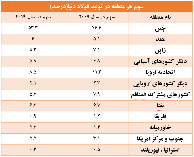 سهم کشور هند در بازار فولاد دنیا از ۵.۱ درصد در سال ۲۰۰۹ به مرز ۶ درصد در سال ۲۰۱۹ رسید و سهم کشورهای خاورمیانه از ۱.۴ درصد بازار به مرز ۲.۴ درصد افزایش پیدا کرد.