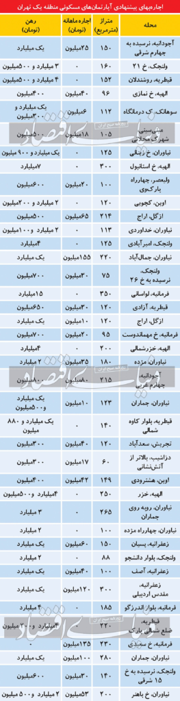 برخی از واسطهها از مهاجرت برخی از این مستاجرها به مناطق پایینتر و ارزانتر از منطقه یک نیز خبر میدهند. موضوعی که پیش از این در میان مستاجرهای مناطق معمولی و مصرفی نیمه شمالی تهران رصد شده بود. در جدول زیر مشخصات تازهترین فایلهایی که هم اکنون در بازار اجاره مسکن منطقه یک شهر تهران برای مستاجرها قابل بازدید است درج شده است.