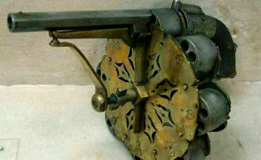 این هفت تیرعجیب و غریب، توسط جوزف انوی در سال ۱۸۵۵ ساخته شده است. سلاح مذکور ۸ سیلندر دارد که بر روی خشاب اسلحه می چرخند. هر یک از سیلندرها می توانند ۶ گلوله شلیک کنند