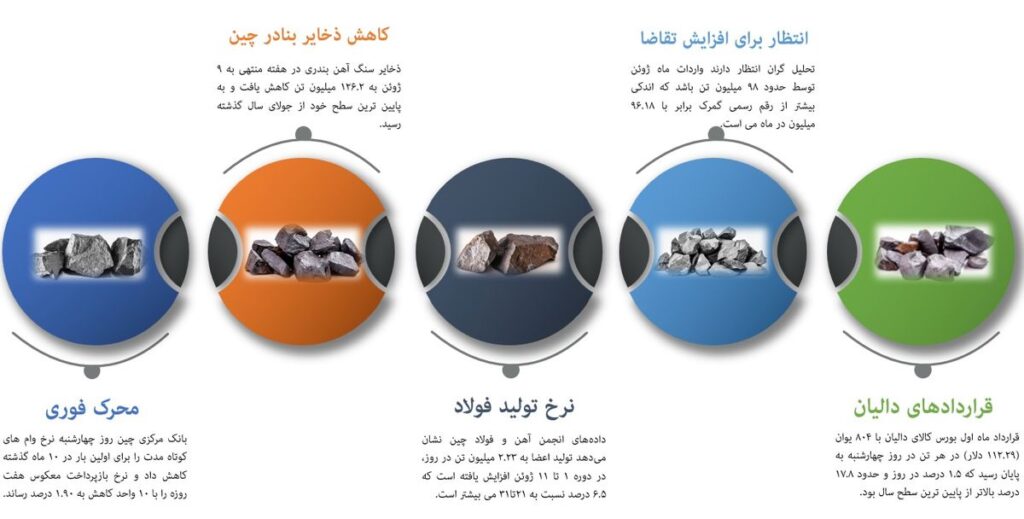قیمت هر تن سنگ آهن عیار ۶۲ درصد از کانال ۱۳۰ دلار در ابتدای سال شمسی، تا نزدیک ۱۰۰ دلار کاهش پیدا کرد که یکی از سنگینترین ریزشهای قیمت سنگ آهن در طول سالهای گذشته بود. کاهش سنگین تقاضا از سوی چین، دادههای ضعیف اقتصادی این کشور و رکود در بخش مسکن چین اصلیترین دلایل کاهش قیمت سنگ آهن مطرح ...